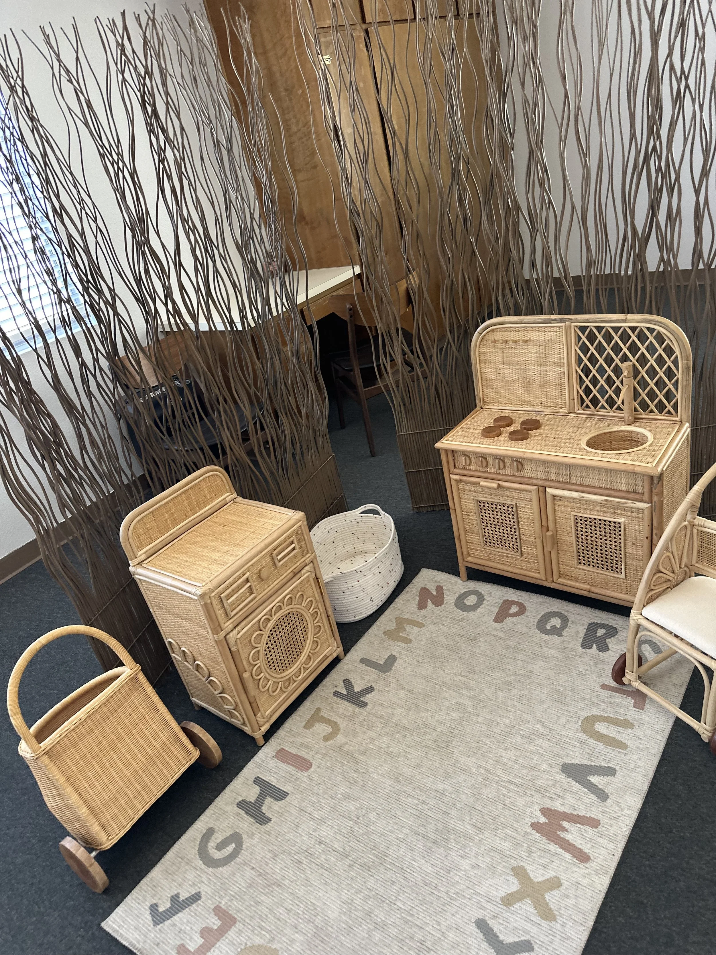 At Lovene Therapeutic Services, our clinic space is intentionally designed to be calm, inviting, and developmentally supportive. We believe the environment plays a critical role in a child's sense of safety, engagement, and joy. Our natural playroom features organic textures, sensory regulating elements, and play-based stations that promote emotional connection and growth. It's more than a therapy room-it's a warm, nurturing space where children and families are truly seen.